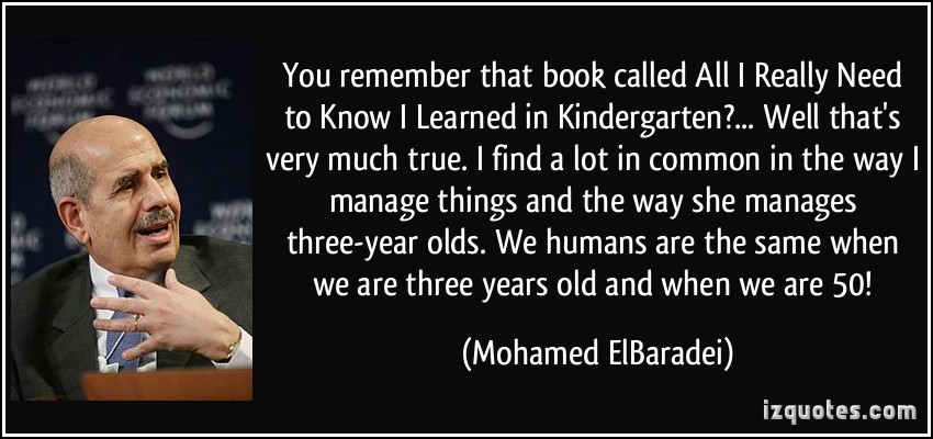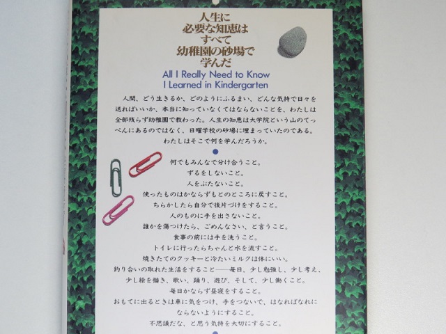 1988年出版で、よく売れた本がありました。All I Really Need to Know I Learned in Kindergartenというタイトルで、まだアマゾンで中古が購入できます; 日本語版 英語版